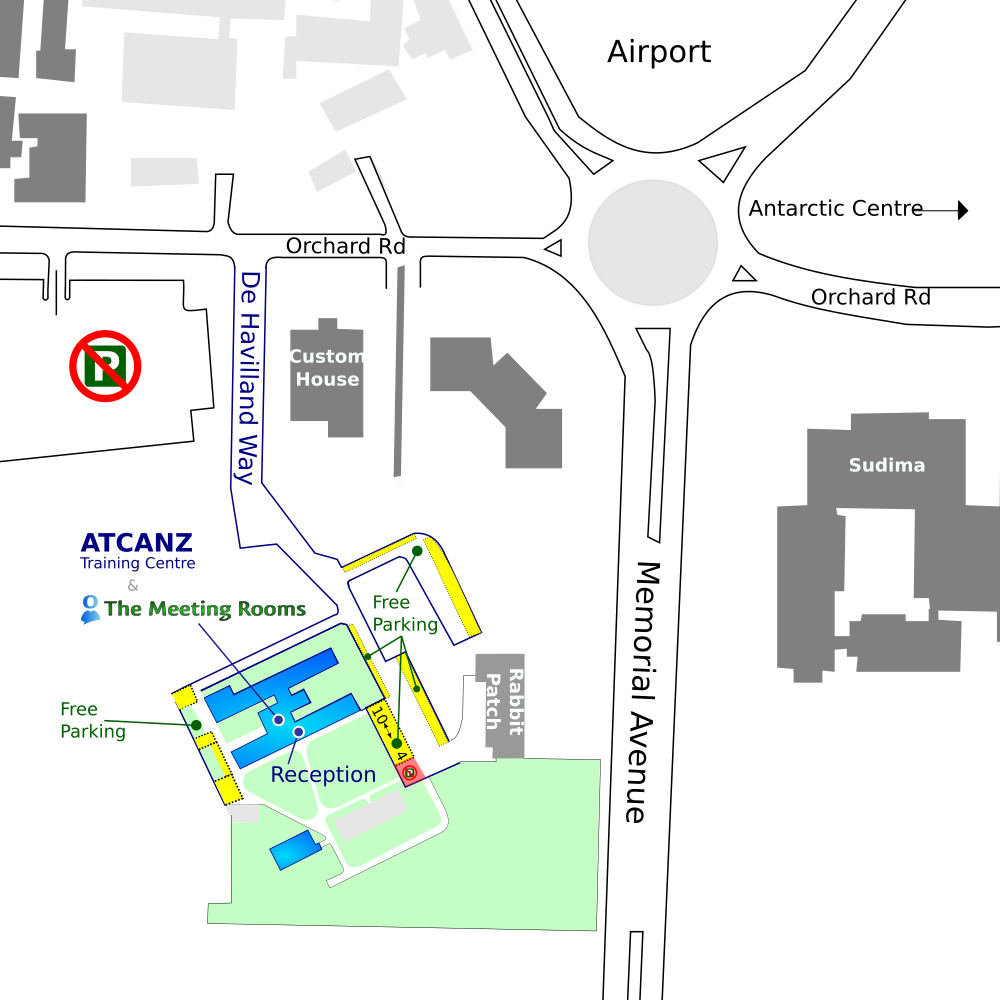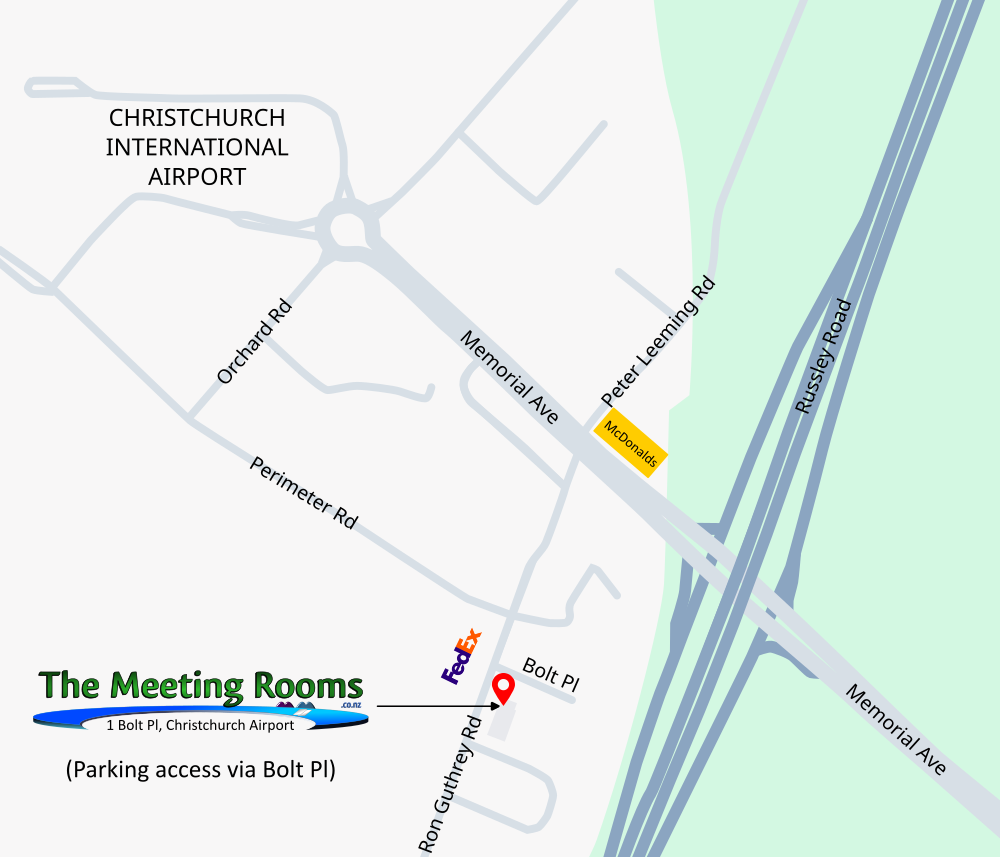 The Meeting Rooms is located at 1 Bolt Place, Christchurch Airport; off Ron Guthrey Road and across the road from FedEx. Just an 800m walk from the Airport terminal buildings. Detailed parking information is available on our Parking Info page. |