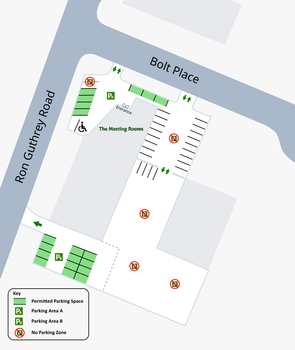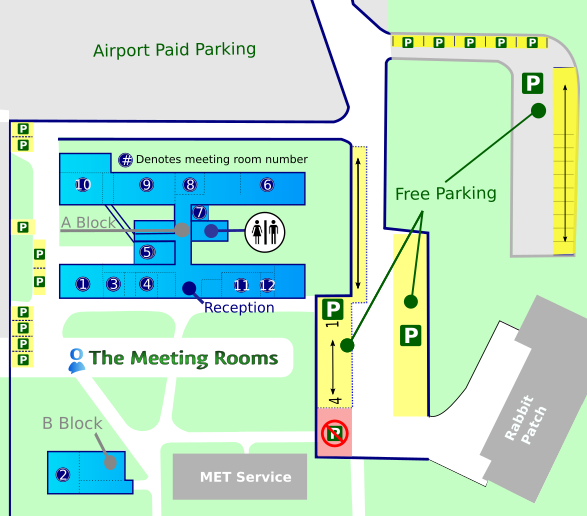 The Meeting Rooms free parking areas are denoted below and highlighted green.