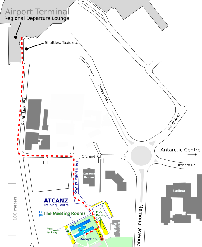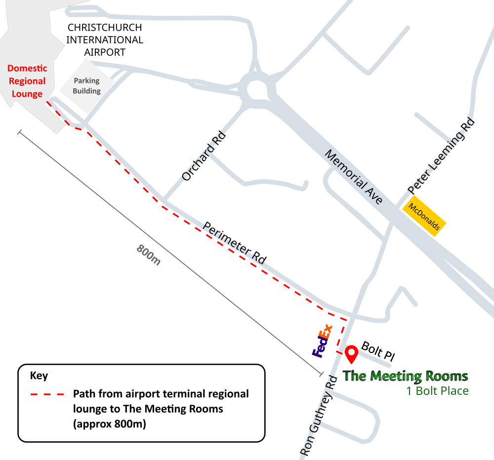 The Meeting Rooms is located at 1 Bolt Place, Christchurch Airport, off Ron Guthrey Road and across the road from FedEx.